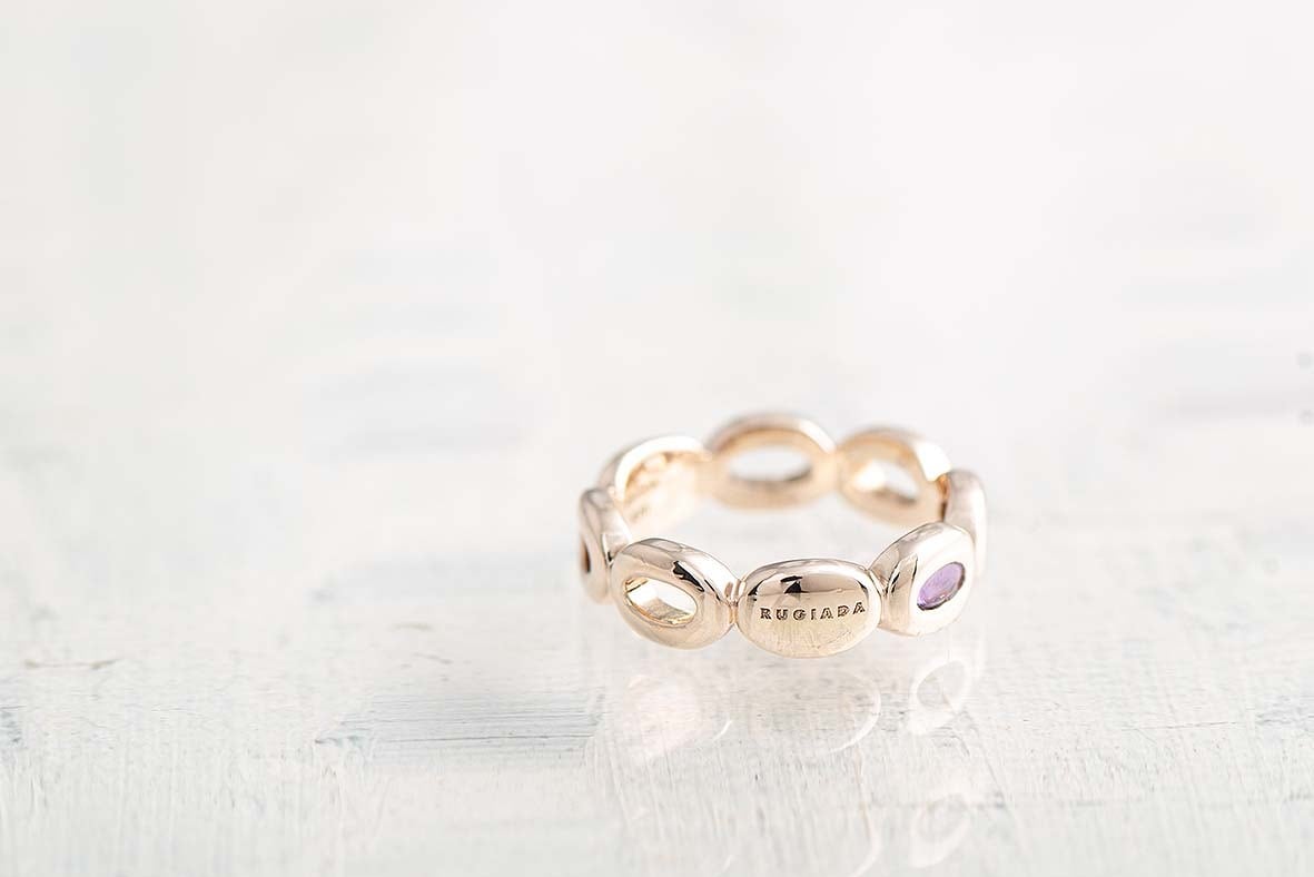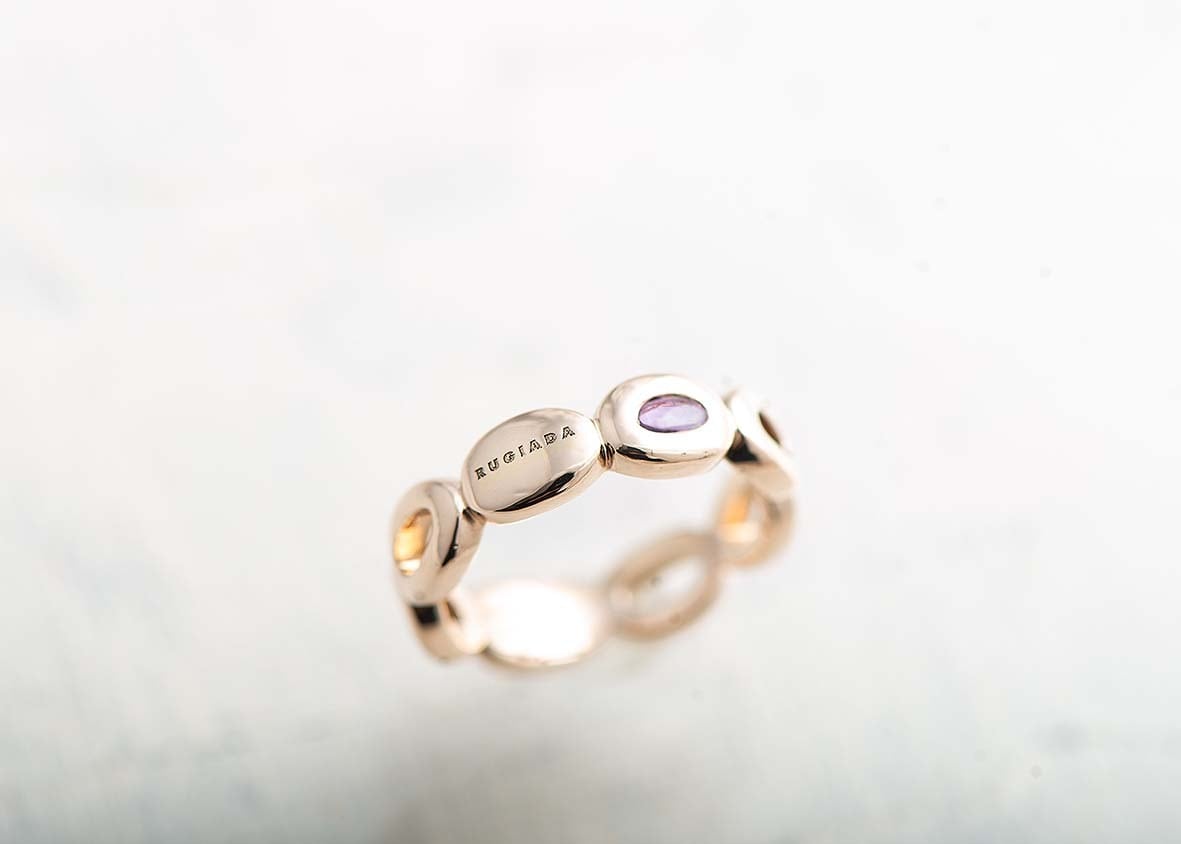 K10PGとアメジスト を組み合わせた『OH!』を繰り返す連続柄のリングです。