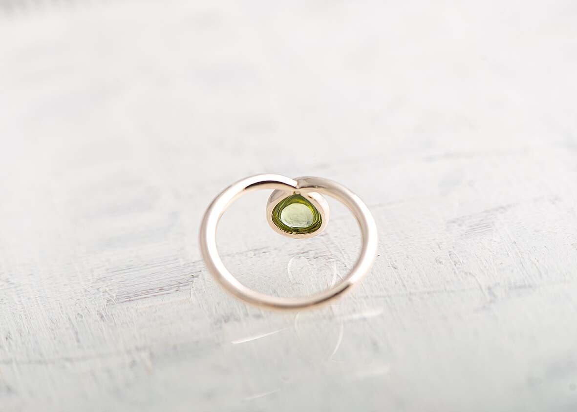 ペリドット はカボションカットで、上面から見たときに地金のラインが途中でもたつかないように、裏留めでセッティングされています。