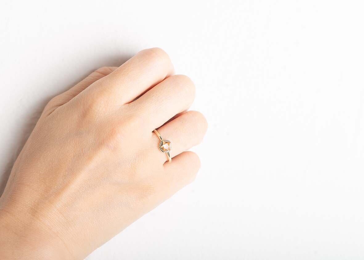中石は、カボションカットとブリリアントカットの中間のような、プリミティブなカットにしてみたくて、あえてファセット面が少ないカットに。上面が星型です。