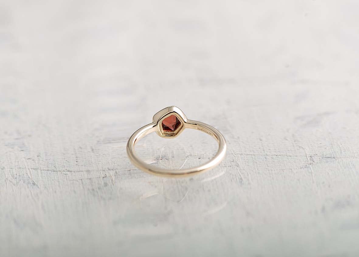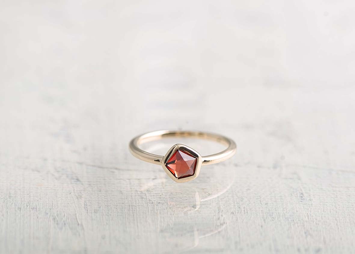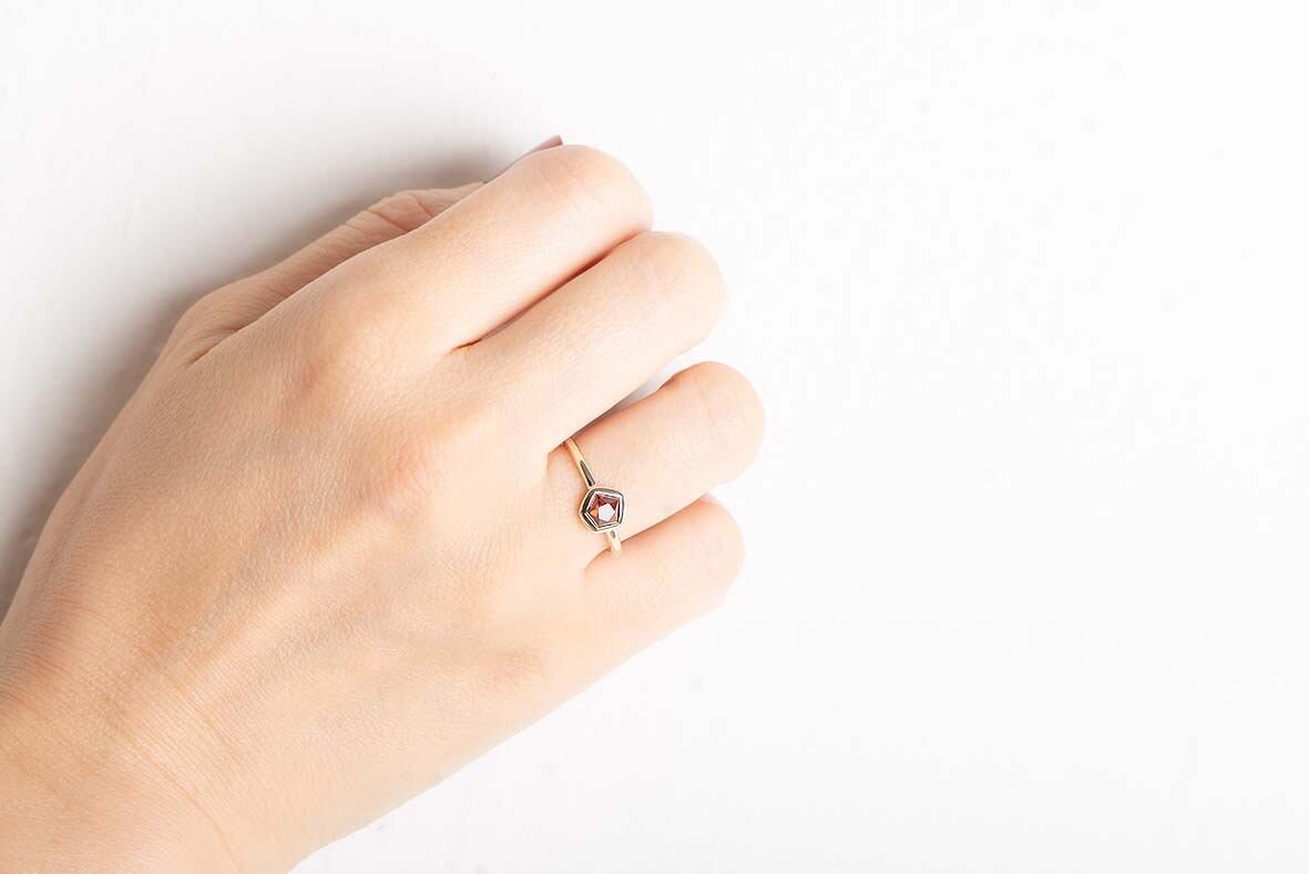中石は、カボションカットとブリリアントカットの中間のような、プリミティブなカットにしてみたくて、あえてファセット面が少ないカットに。上面が星型です。