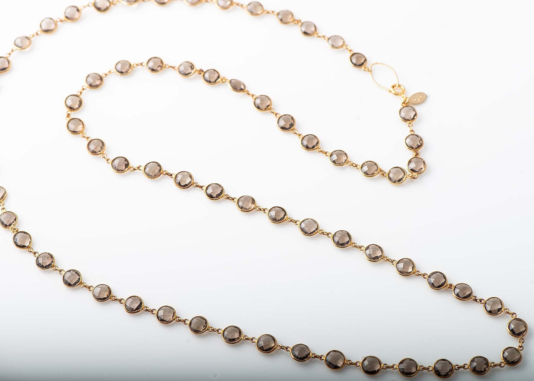 チェッカーカットがきらりと光る、ラウンド型のスモーキークォーツをたっぷり使ったロングネックレス。